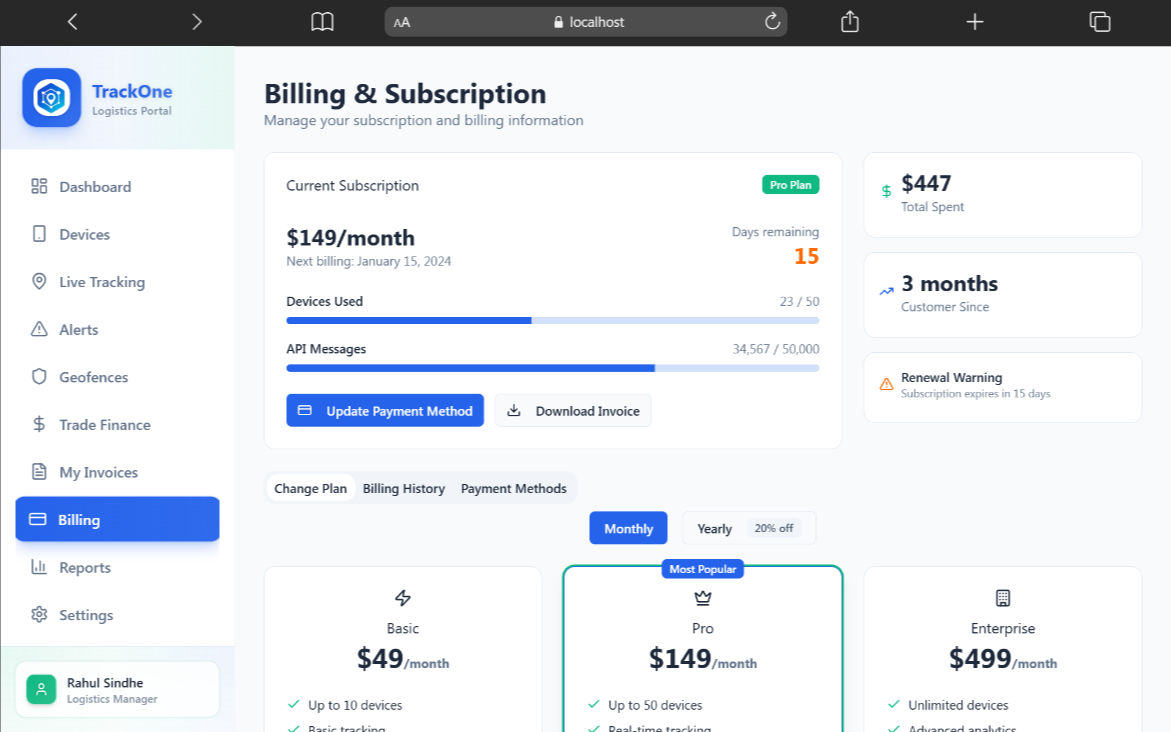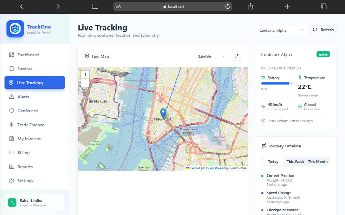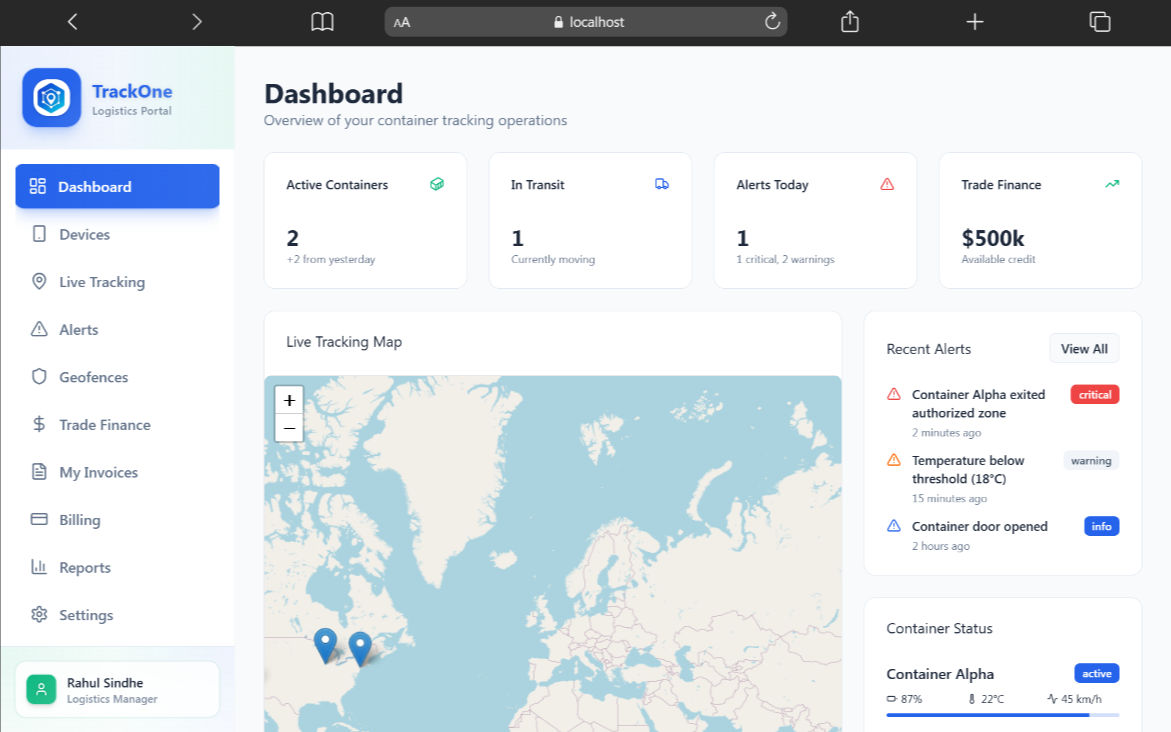 Track & Trace is a comprehensive, dual-role SaaS platform that combines advanced container tracking with integrated trade finance solutions. Designed for logistics companies and financial investors, it provides real-time GPS tracking, fleet management, intelligent alerts, and seamless access to trade finance options.