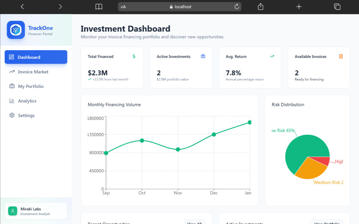 For financial investors, Track & Trace offers a dedicated view to monitor portfolio performance. Track your total investment, calculated interest, and risk exposure in real-time. Identify high-yield opportunities in the logistics sector backed by verified movement data.